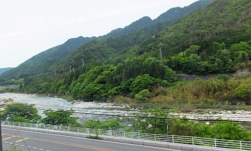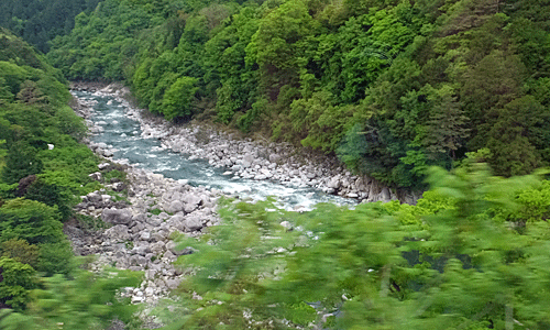| 列車の中から-1 多治見駅6:00発の普通に乗って中津川駅まで 中津川駅で乗り換えて木曽福島駅へ そこからぐるぐるっと歩く計画 前回の下見の時より春が進んで 新緑の時期は過ぎ、濃い緑になってきていた |