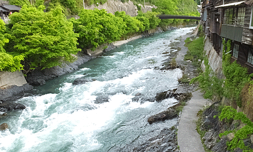 | 橋から見下ろした木曽川 今日は水量が多い 白いしぶきをあげて勢いよく流れていた |