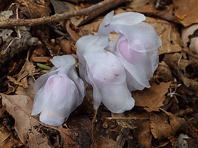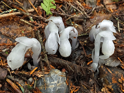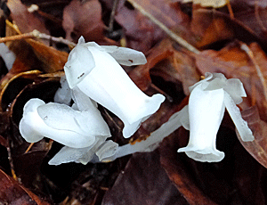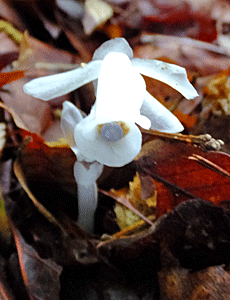 | ギンリョウソウ:ツツジ科-1 枯葉の中から顔を出したばかりの真っ白! |