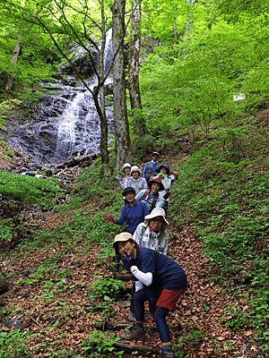 | 滝をバックに全員で集合写真 |