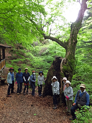 | バックの木はブナ 人がすっぽり入るほどの大きな洞が出来ている でも、まだ葉っぱも繁り生きている すごいね〜 |