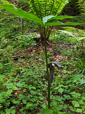 | マムシグサの仲間:サトイモ科テンナンショウ属 多治見でよく見かける、 白と緑の筋とは大違いのチョコレート色 そして、葉っぱは、花より上にある 中にある『付属体』もチョコレート色 |