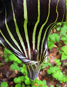 | マムシグサの仲間:サトイモ科テンナンショウ属 さっきは、チョコレート色に白い筋 今度は緑色に白い筋 葉っぱは下に付いている |