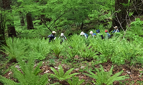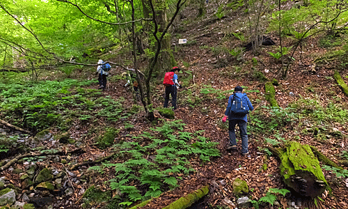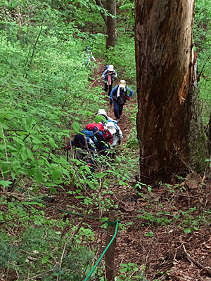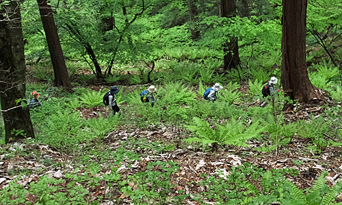 | さあ、出発 紅葉ヶ丘へ行く前に、二の丸跡と三の丸跡へ寄ってみた 何にもない平らな場所があるだけ その間は、マイヅルソウの葉っぱで埋め尽くされていた 先行グループは、三の丸跡から 左へ降りる急坂をどんどん下って行った そちらの方面からも紅葉ヶ丘へ行けるのか? 何か標識でも立っていたのか? ・・・と思いながら下りて行ったが 方向が紅葉ヶ丘と正反対 「標識があったの〜?」と声を掛けてもないらしい 「戻ってきて〜」と呼び戻した |