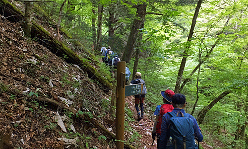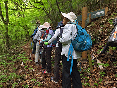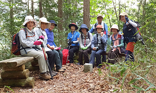 | 三角点を前にして、集合写真をパチリ さあ、下山 ここからは、先頭を交代しながら歩くことにした |