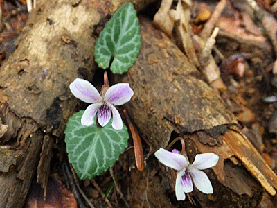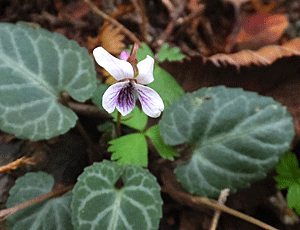 | フイリフモトスミレの仲間:スミレ科 葉っぱに白い筋が入っているのは、 フイリフモトスミレだと思い込んでいたが 木曽町観光協会で購入した図鑑「城山史跡の森の植物」には 「フイリフモトスミレ」と 「フイリシハイスミレ」の2つがそっくりさんで並んでいた 違いは?? ↓