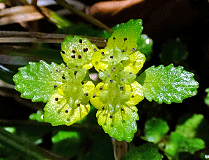 | ネコノメソウの仲間:ユキノシタ科 ニッコウネコノメかも? 今日は既に実になっていた 前回の下見では、花が咲いていた ↓ |