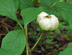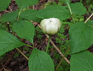 | ヤマシャクヤク:ボタン科-1 左 三角点へ登る前の状態 10:02 右 帰り道 10:43では、すこうし開き始めていた |