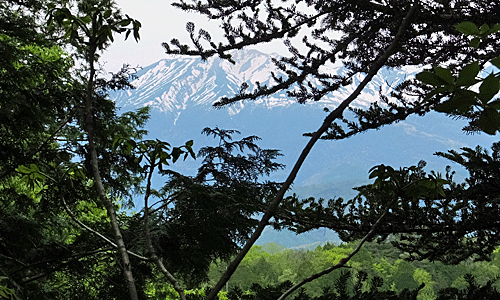 | 三角点から少し進んだ所から(かわった建物がある) 木の間から、思いがけず大きな御嶽が見えた |