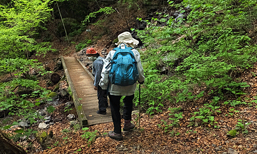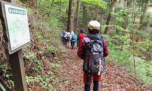| 全員集合場所Hは、ここ権現滝 希望を聞くと、 早く帰りたいグループは2名 そうでもないグループは8名となった 列車が1台遅れると2時間後になることは 前もって話してある 登りに使った道なので勝手は分かっている 後は、気を付けて歩けばいいはず |