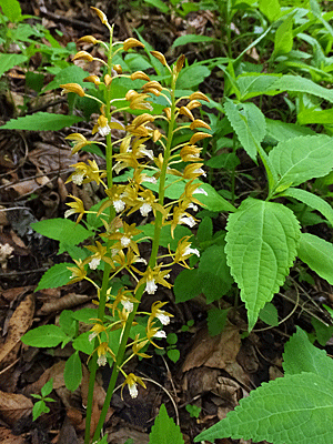 | コケイラン:ラン科 黄色い塊が目に入った 近づいて行くと、「エビネだ!」と思った 「痩せたエビネだね」の評も 山だから痩せているのかも・・・と思ったら コケイランが、本当の名前だと後日連絡があった (別名:ササエビネ) |