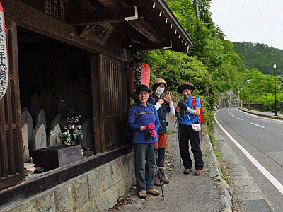 | 行人橋を渡ったら右折 この大悲観音前の小スペースでミーティング 全員集合場所のA ・全員集合場所のこと ・そこまでは各自楽な歩き方でいいこと ・早く着いたら飲んだり食べたり休んだりしていていいこと等々 今日の参加者10名 |