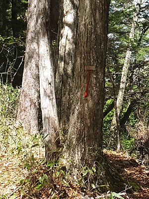 | 「児野山」 手書きの標識が打ち付けてある 10:18着 先行グループは、休憩したり、御嶽山を展望したりしていた |