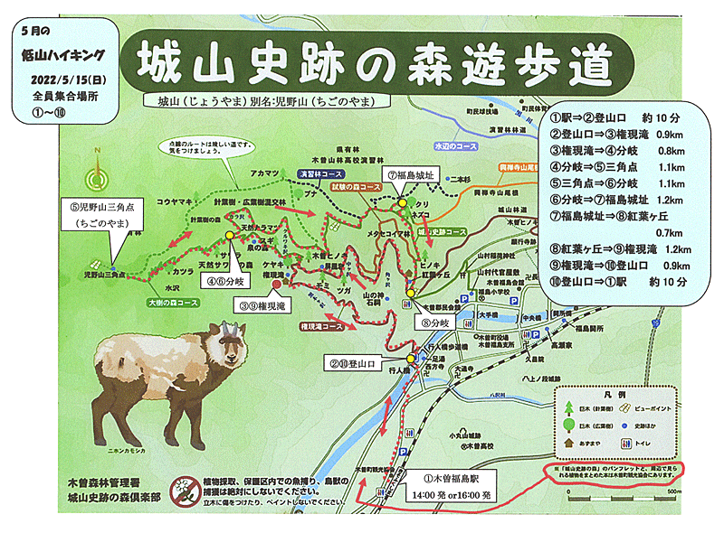 | 最後のグループ 登山口に到着〜 13:26 みんな早く歩いたんだねえ ここから約10分で駅に着く 駅への途中にあった木曽町観光協会へ寄って、 『フィールド・ガイド」(城山史跡の森)』を10部貰い(無料) 『城山史跡の森の植物』を購入して(500円) 駅へ行った 木曽福島宿の見学は誰もしないらしく 14:00発の電車に、全員乗ってしまった お疲れ様〜 ・・・・・・・・・・・・・・・・・ 行動時間 約5時間50分 歩数 2万1700歩(ヘルスケア) 歩いた距離 8.2km(ジオグラフィカ) 歩いた距離 13.4km(ヘルスケア) ↓ いつも不思議に思うのだが この2つの大きな違いは何故だろう? |