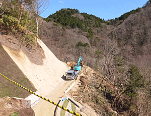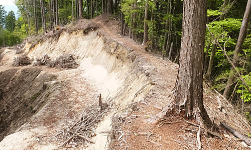 | 下山口手前の土砂崩れ こちらから登ってきた団体さんが、 「う〜ん、通れたよ」ってことで、 下りていったのですが… 道はなく、まるっきりの溝でした |