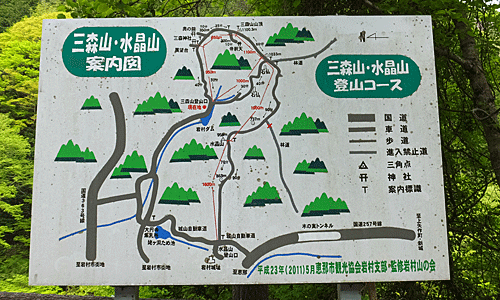 | 駐車場にあった案内図 ネットに、「登山道が荒れている」という情報があったが この案内図には書いてなかった およそのコースタイムの目安として 「ここから三森神社まで 40分 三森神社から山頂まで35分 山頂からダム分岐まで60分 分岐から水晶山往復 180分 分岐からここまで30分」・・・と書いてあった 私は水晶山で2人と別れて、 岩村駅まで歩く予定 |
