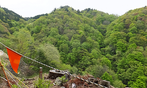 | ここからも岩村ダムへ下りられる (2枚の画像は同じ場所) が、「この先 急傾斜 きけん」と 大きな赤字で書いてあるので ここから下山する予定だったが ここからの下山は止めた・・・と、後で分かった それでも、さっきのグループが登ってきた道は 「土砂、まあまあすごいことになっていた」そうである |
