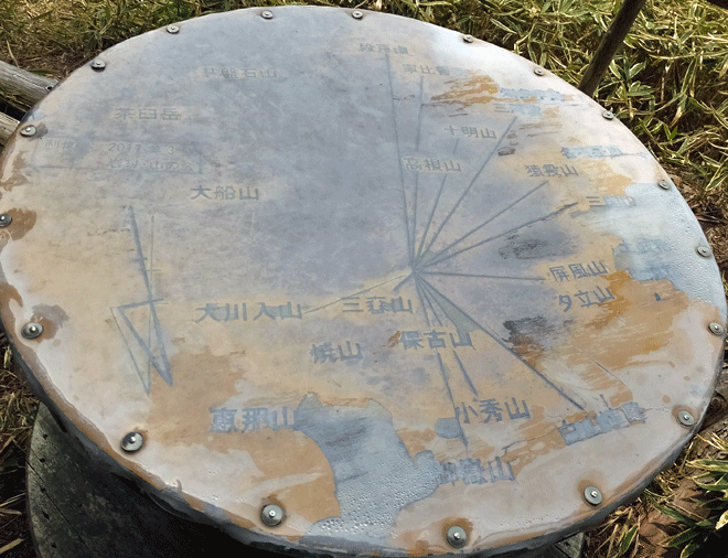 | 方向指示板 たくさん山名は書いてあるけれど、 特徴のある形の山は御嶽くらい (今日の御嶽は雲の中 うっすらと白い雪が見えたので御嶽だと分かった) その他の山ははっきりしなかった・・・ |