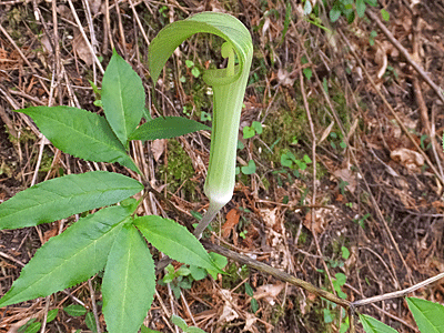 | スルガテンナンショウ:サトイモ科 この辺り、この株が多かった 左 その中で一番大きくて頑丈そうな株 右 「仏炎苞(ぶつえんほう)」と呼ばれる ぺろりとした覆いの部分をめくると 白くて丸いものが(付属体という名前) 前に傾いていた これが、スルガテンナンショウの特徴 花は、この付属体の下にある めくって見てくればよかった・・・と 後で悔やんだ |