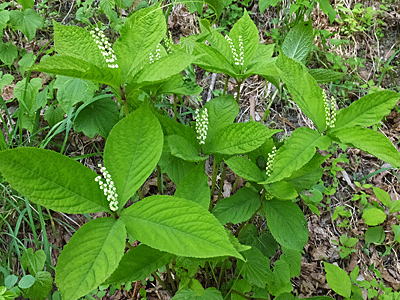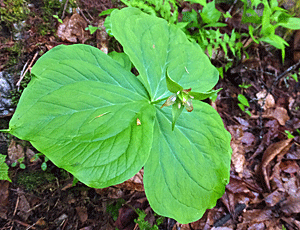 | シロバナエンレイソウ(別名ミヤマエンレイソウ):シュロソウ科 残念! 株はたくさんあるのに、花は皆終わっていた |