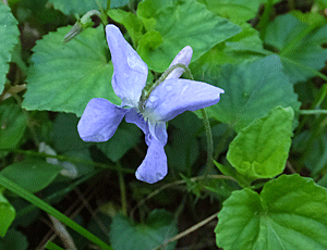 | タチツボスミレ:スミレ科 フツーのタチツボスミレ(と思う) 見上げる高さで、勢ぞろいしていた 観光チラシを見ている2人に出会った きっと道を間違えているんだと思って 「どこへ行きたいのですか?」と、声を掛けた 「薮原」という返事 やっぱり! ここは峠山へ行く道です・・・と言って 「戻って左へ」と案内 標識に書いてある Uターンの意味が分からなかったらしい |