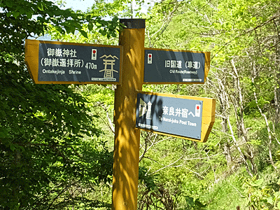 | 中山道はここから右折するように・・・の案内 10:15 林道を通ればすぐなんだけれどね さて、奈良井駅を13:32発の電車に 慌てないで乗る為には、どこまで行けるか ・・・が、今日の下見の目的 峠の茶屋から1時間半あれば、良いだろう →(12時には出発する) 峠の茶屋で休憩するから (11時半には戻ってこないと) ・・・などと考えながら歩いていた |