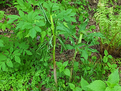 | マムシグサの仲間:サトイモ科テンナンショウ属-3 まだ葉が折りたたまれている状態 うまいこと折りたたんで、鞘状の中に入っていた分け |