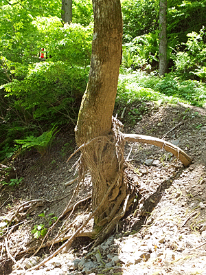 | ここが、大規模な土砂崩れがあった場所 大きな木に、押し流された木の痕跡 草地が無くなり、裸の土が露出 |