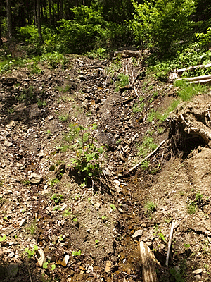 | 山肌が削られ、木も草も流された痕 |