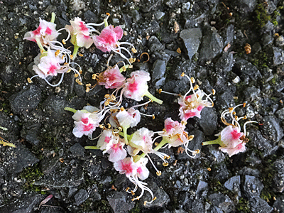 | トチノキの花:ムクロジ科 歴史民俗資料館の敷地内に、いっぱい落ちていた 見上げても、あまりの高さで、花穂は見えなかった |