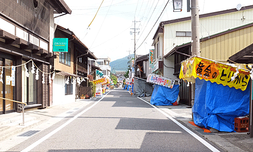 | 人通りのない目抜き通りを歩いて行くと、 両側には「シデ(紙垂)」と、 それを結わえ付ける細い注連縄(しめなわ)が 町中の通り沿いにある家々(家だけではなくずっと)に 張り巡らされていた 通りの上の方には御神燈が掲げられ 家々の入り口にも掲げてあった 家の前にたたずんでいた男性に話を聞くと 「昨日・今日の2日間 薮原神社お祭りがある これから鳥居峠へ行くのなら 途中で女獅子の山車(だし)に出会うかも (男獅子の聞き間違いだったかも?) 神輿も出て、 今年はコロナのためできないが、 いつもは、夜、お酒がどの家でもふるまわれる・・・」と それを楽しみに宿場の中を歩いて行った |