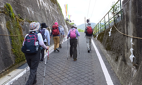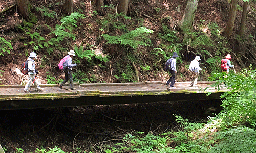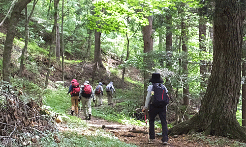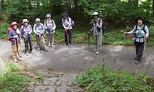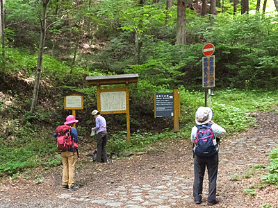 | 消防署を過ぎ、鳥居峠越えコースの入口案内板へ 全員集合場所のC 9:20 舗装道路を離れ、木陰の道へ入ると すう〜っと涼しくなった |
