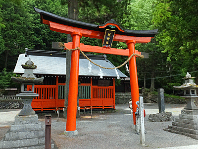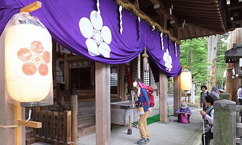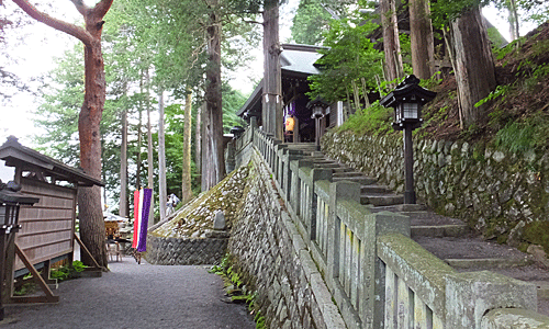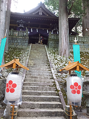 | 右から階段を登る参詣用の階段があったが 前方を見ると、チラリと神輿が見えた |