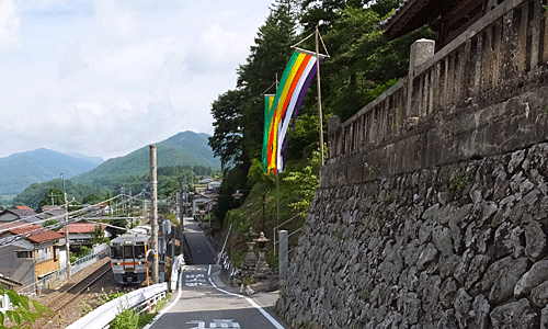 | お隣の極楽寺へも立ち寄ってから、 鳥居峠を目指して坂道を下りていくと 丁度、中央線の列車が来るのが見えたのでパチリ 五色の吹き流しがはためいているのもお祭りらしい |