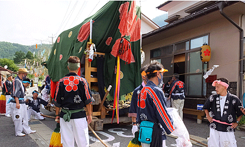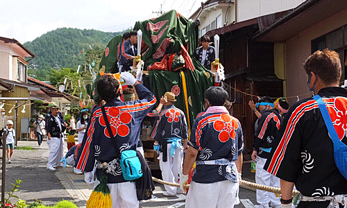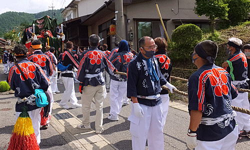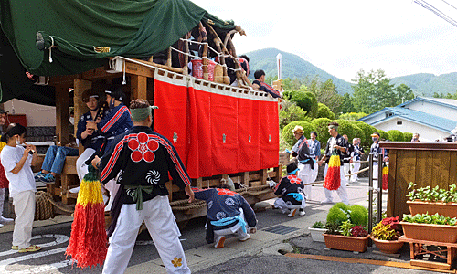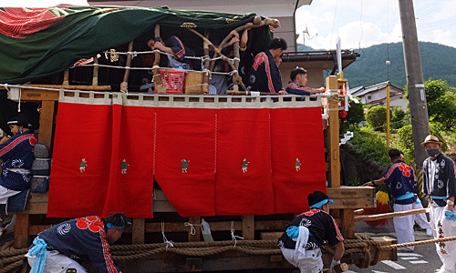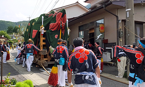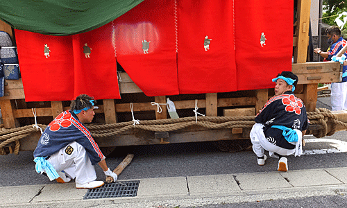 | ↑ このブレーキ係は、一番大変そう〜 坂道が多いので、 移動は少しずつ・少しずつ それでも、勢いがついてガタガタンと早くなるのを この木の棒でストップさせる役らしい 横笛吹きの女の子が、 2人揃って後ろへ倒れたこともあった この辺りの坂道はまだいい方 さっきの薮原神社へ登りや下りは、 傾斜がきついので、と〜っても大変だと思う! |