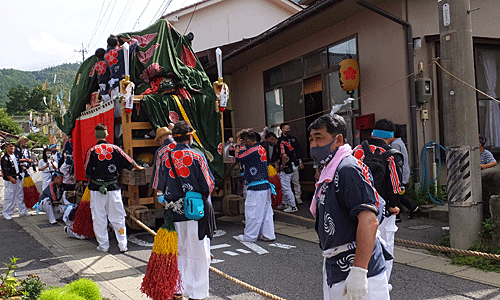 | 太縄役の人は、前と後ろに配置されて 進行とブレーキの両方の役割だろうね 少しずつ動き出したので、 私達も山車を後にして鳥居峠入口へ 9:01 ************************* |