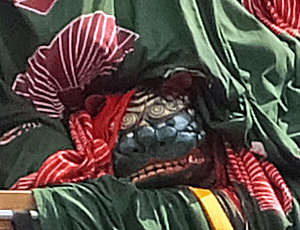 | ↑ この頭の黒っぽい獅子は「男獅子」というらしい 調べてみたら、『緑頭の上獅子』というから、 濃い緑色のよう では、「女獅子」は? 『(赤頭の下獅子)』と言われるので、赤っぽいんだね 下は、男獅子の頭の部分を拡大 |