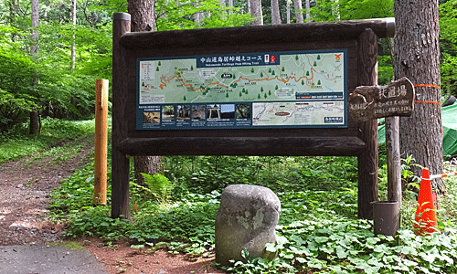 | 中山道鳥居峠越えコース 出口の説明板 ここから約30分で奈良井駅に着く |