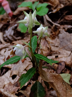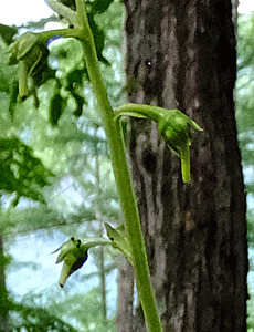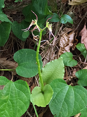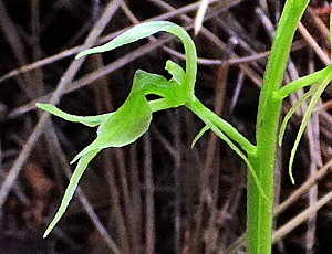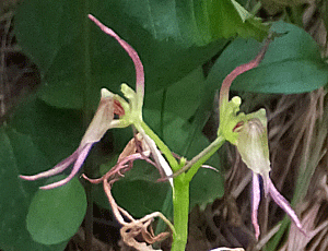 | クモキリソウ:ラン科 広い林道を歩く時は、左右に目を配ることはできないので 左ばかりを見ることにしている そんな時、ぱっとこの花が目に飛び込んできた! 標本にできそうなきれいな形だった |