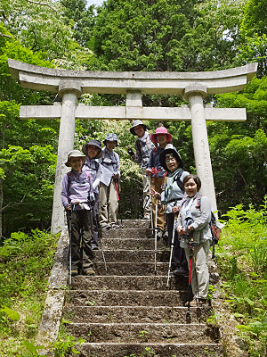 | 全員集合場所のF 御嶽神社の鳥居の下で、集合写真 |