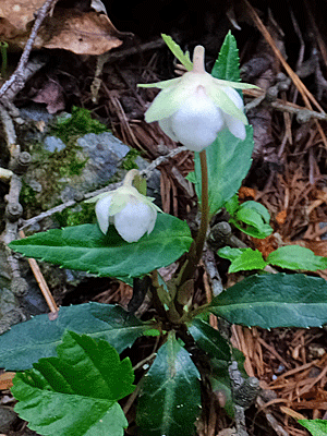 | ウメガサソウ:ツツジ科-1 林道の左側を見下ろしながら歩いていたら、 ぱっと白い花が目に飛び込んできた その後も、何株もに出会った |