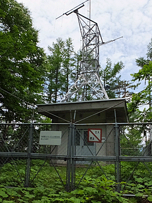 | この「峠山無線局舎」が、全員集合場所のH 今日の引き返し地点 11:28 期待していた御嶽は、やっぱり見えず ここまでの緩い登りの林道の左右で 今までになかった花に出会えたので 大変だったが、ま、いいか・・・ |