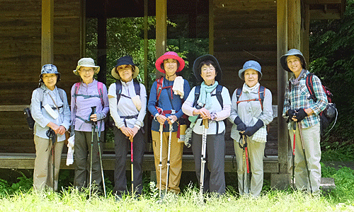 | 全員集合場所のI 鳥居峠「峠の茶屋」で 12:16 慌ただしくランチ休憩して(15分!)から 急いで集合写真をパチリ ・・・・・・・・・・・ 急がせてゴメンね! ここから奈良井の駅までは、1時間ちょっとかかるから 列車の発車時刻は、13:32!! |