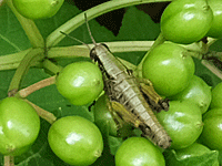 | カンボク:レンプクソウ科 花を期待していたが、すでに終わって実がなっていた 特徴ある3裂する葉が、虫に食べられていた その元凶はこのバッタの仲間らしい ↓ ![]() |