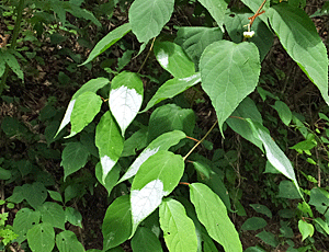 | マタタビ:マタタビ科-1 花期になると、葉っぱ(すべての葉では無い)が、 白いペンキをペタペタ塗ったようになる 雌雄異株で、雄しべだけある花は雄花 雄花は咲いたら落ちてオシマイ 雄しべと雌しべのある両性花に実がなる 花は、葉の下側に咲くので、 くるりとひっくり返さないと見つからない 実も同じ |