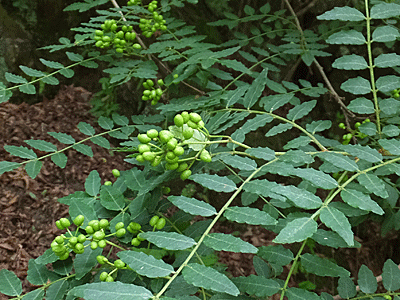 | サンショウ・ミカン科 背を軽く超す高さだったので、 カラスザンショウかも?と思って、 葉っぱをちぎって匂いを嗅ぐと まさしく本物のサンショウのい〜い香りだった |
