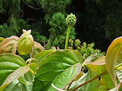 | ヤマボウシの実:ミズキ科 熟すと、棒の先に丸い飴を付けたようになる |