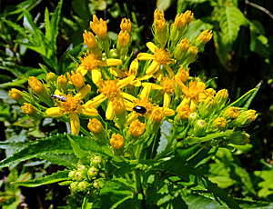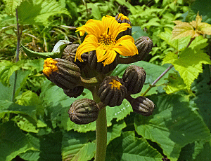 | マルバダケブキ:キク科 大きな葉っぱと、太い花茎が特徴 ネットの中にたくさん株があった 咲き始めたばかり |
