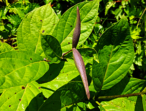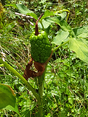 | テンナンショウの仲間:サトイモ科 茎が太くがっしりしていた 4月頃。伊吹山を訪れると、 白い仏炎苞と茶色の仏炎苞の株があったが、 今の時期、同じような実になっていて 区別は出来なかった |