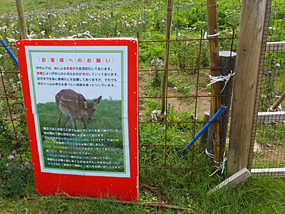 | シカによる食害の看板 柵などを作っても入り込んで草花をたべたり、 地面を掘ったりして困る・・・という内容 |